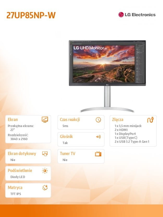 LG Electronics Monitor 27UP85NP-W 27 cali UHD IPS USB-C V.DisplayHDR